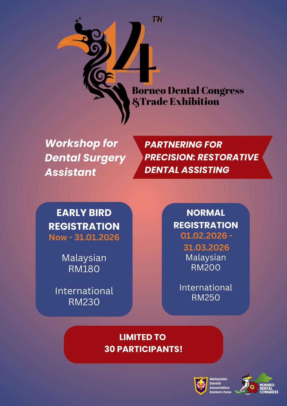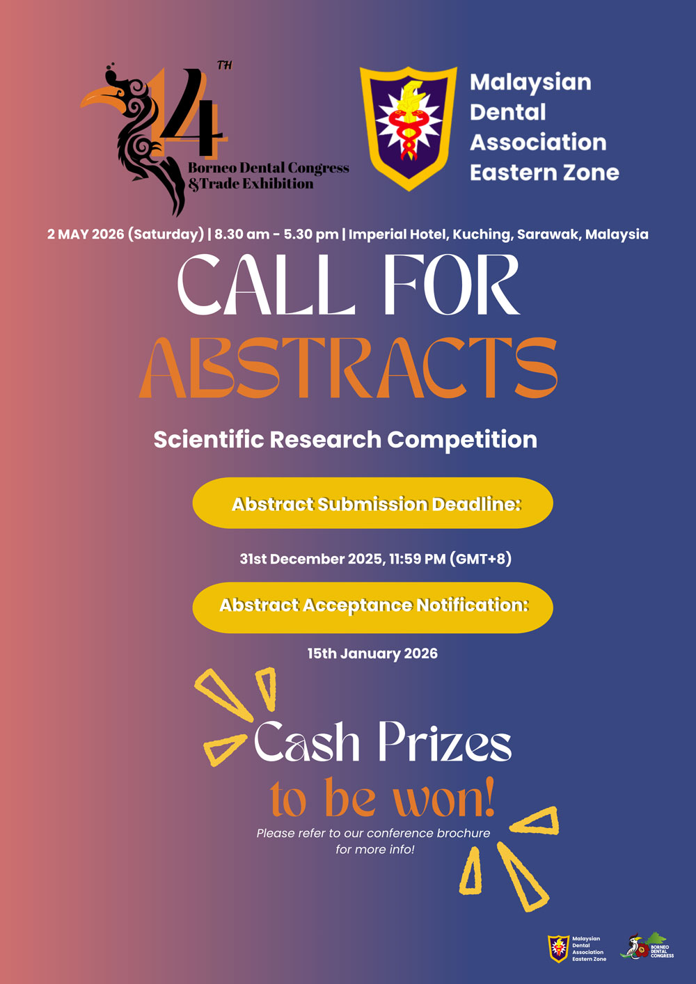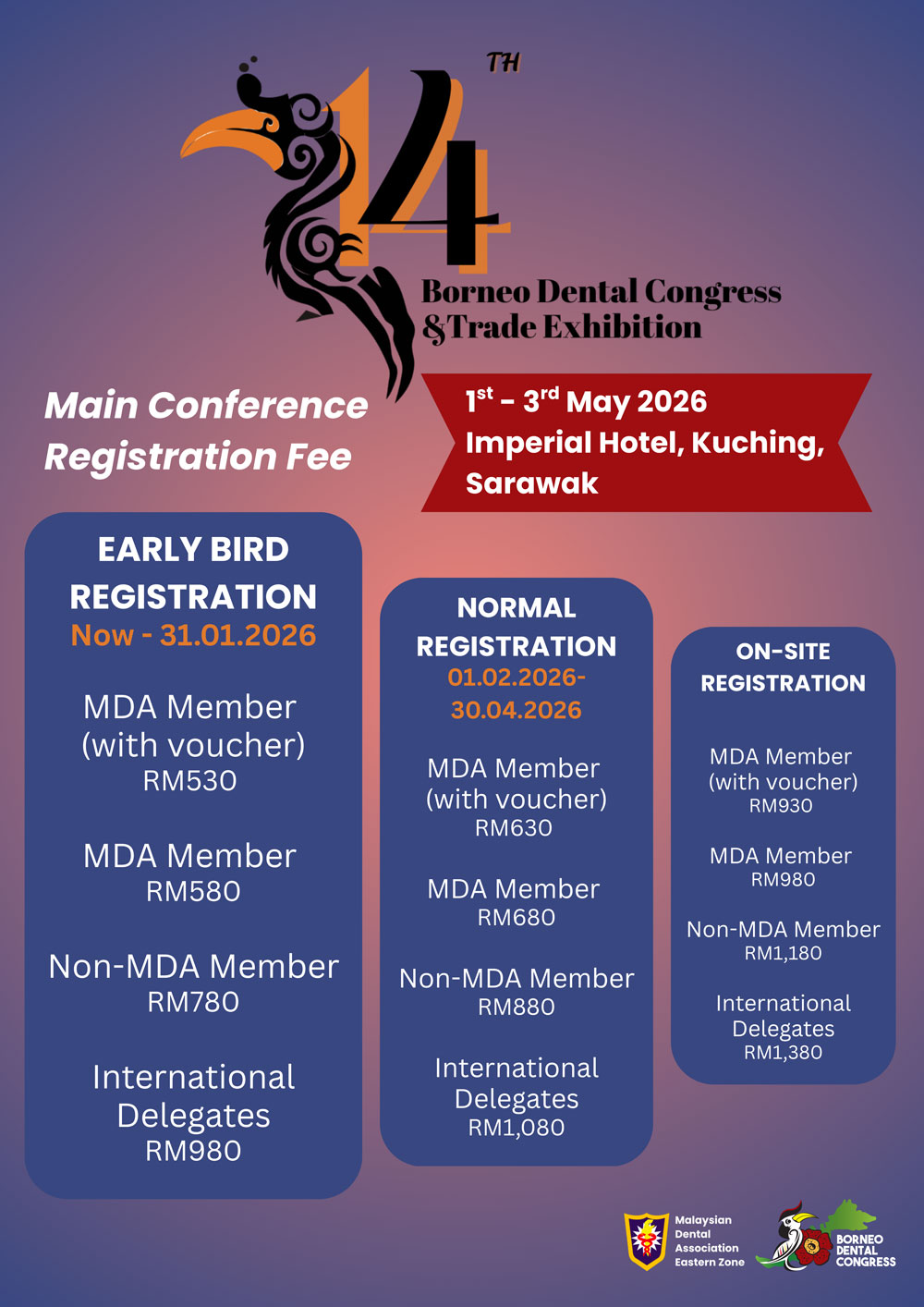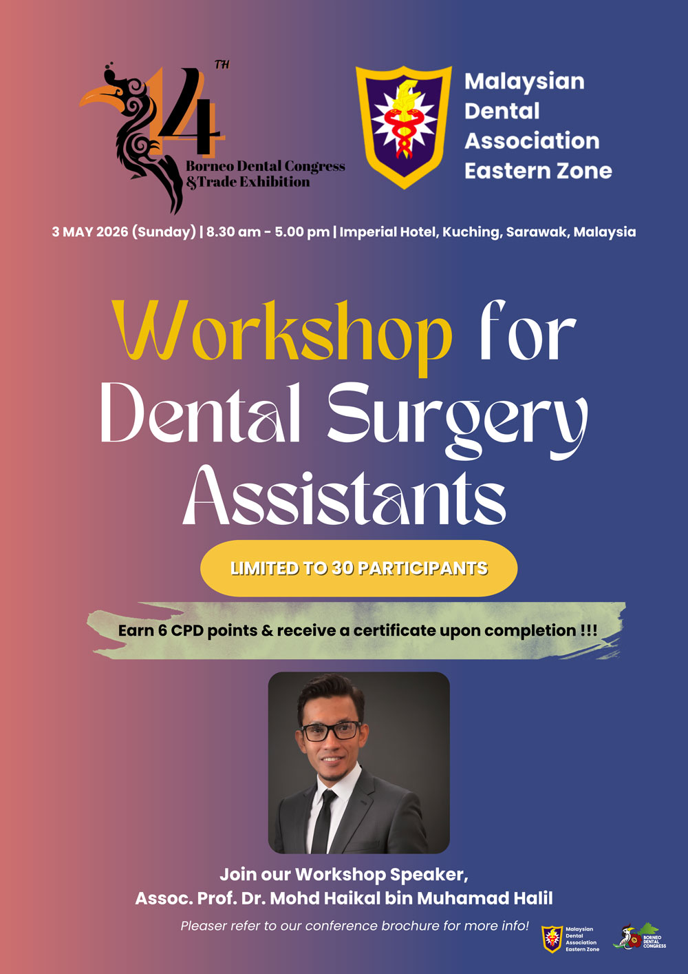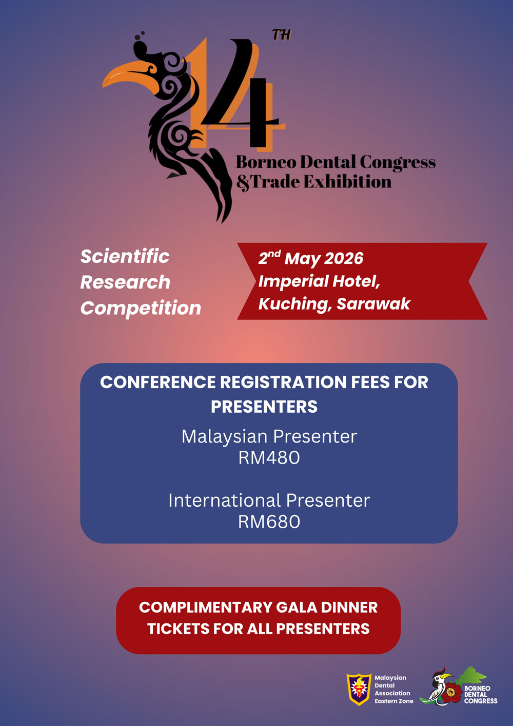 Day(s) : Hour(s) : Minute(s) : Second(s) Book your seat today! Scientific Speakers Keynote Speakers Workshop for Dental Surgery Assistant Scientific Research Competition Registration Main Conference Dental Auxiliary Conference Workshop for Dental Surgery Assistant Scientific Research Competition Scientific Speakers Keynote Speakers Workshop for Dental Surgery Assistant Scientific Research Competition Registration Main Conference Dental Auxiliary Conference Workshop for Dental Surgery Assistant Scientific Research Competition Download Scientific Research Competition Scientific Research Competition https://web.mda.org.my/scientific-research-competition-14th-bdc/ Workshop for Dental Surgery Assistant Speaker Keynote speaker Main Conference Dental Auxiliary Conference Contact Us Borneo Dental Congress borneodentalcongress Imperial Hotel, Kuching, Sarawak [email protected] +6017 7887 644