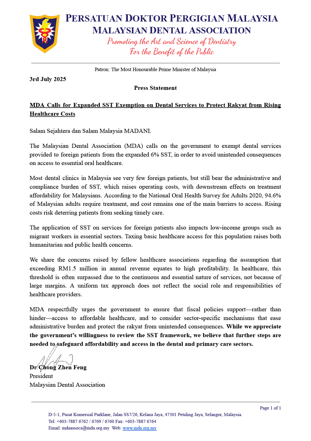 MDA Calls for Expanded SST Exemption on Dental Services to Protect Rakyat from Rising Healthcare Costs