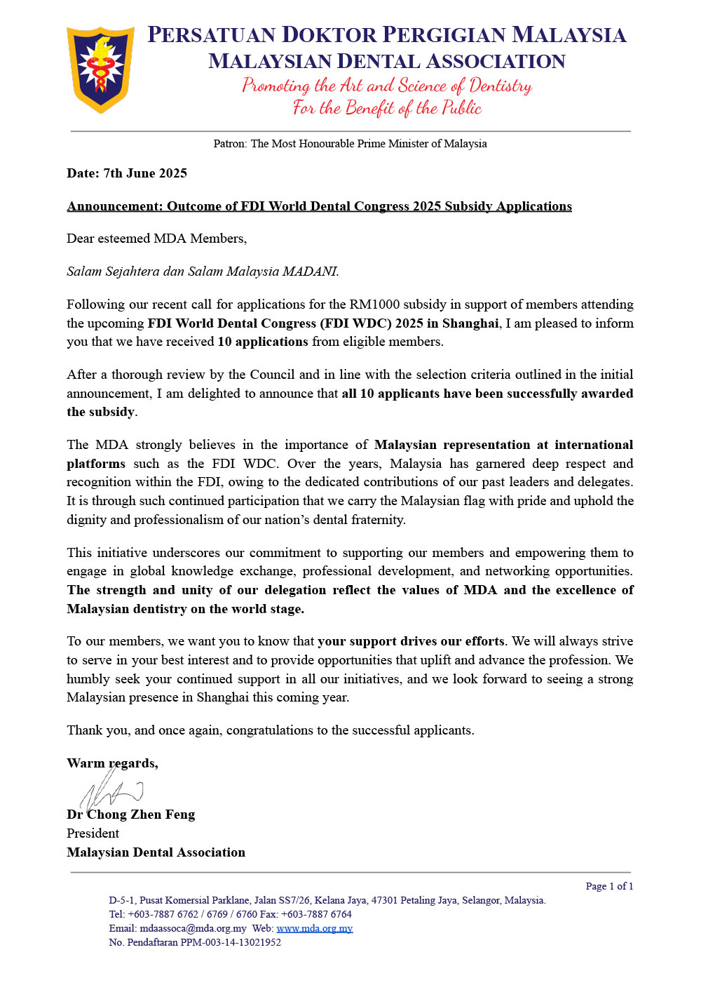 Announcement: Outcome of FDI World Dental Congress 2025 Subsidy Applications