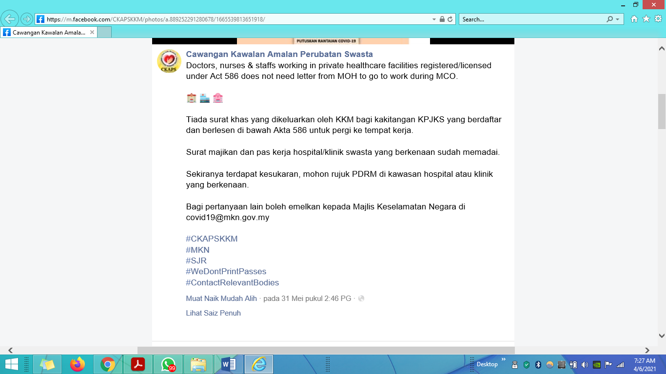 The MCO 3.0 of our country is understandable, painful but necessary. However, it has brought to our attention by fellow private practitioners that approval letters, despite the fact that dental healthcare service is categorized under essential services, operation and permission to travel to work are needed to be applied from CIMS 3.0 through the MITI portal. In beginning of the lock down, we were under the impression that private dental healthcare services will continue to operate as usual and that a letter from the employer / work pass would be sufficient for travel to work, as what we went through in the previous MCOs. This was also reiterated by CKAPS on their posting as below: